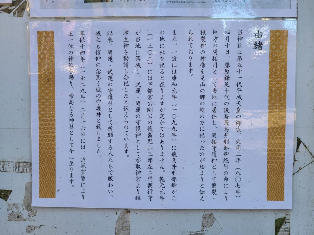 創建年代は、平安時代にさかのぼり、この地の開拓守護神として、近隣に位置する児山城の乾の方角に造られたそうです。