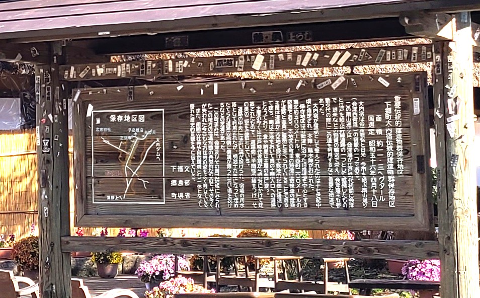 不鮮明な画像ですが、大内宿の入口付近に立つ説明板です。