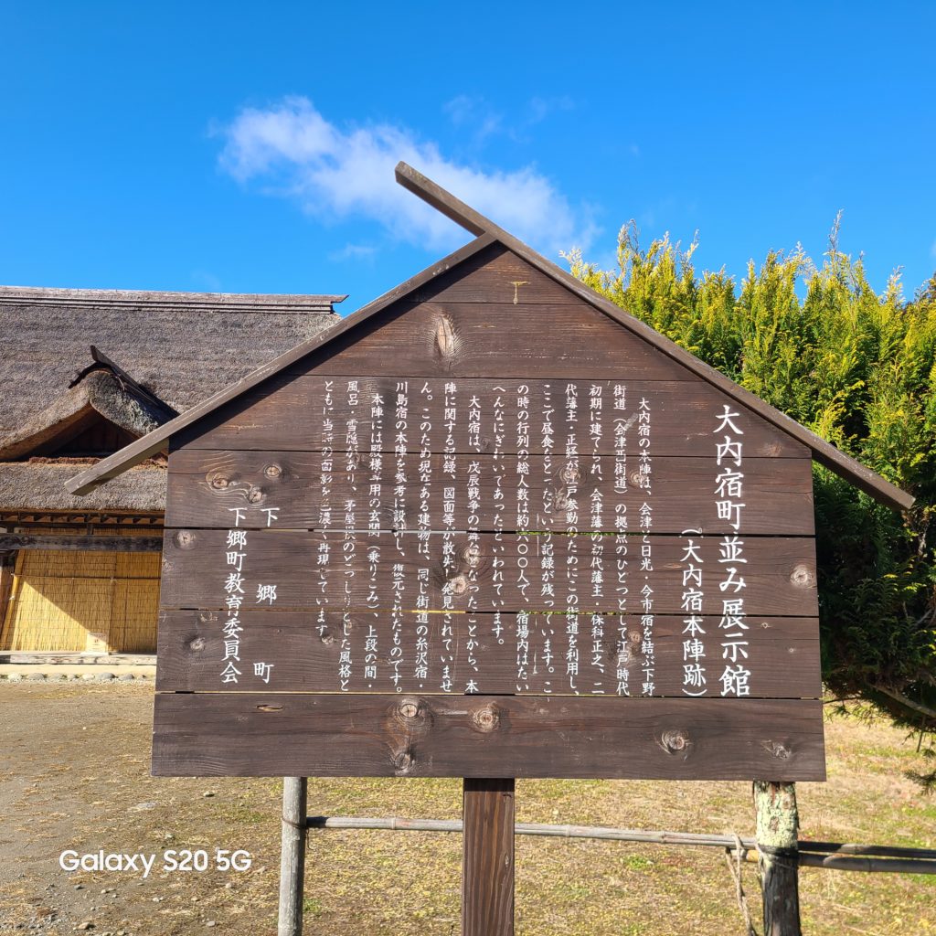 見にくいかも知れませんが、大内宿は17世紀(西暦1600年代・江戸時代)の中頃に会津西街道として整備されたことなどの歴史や、町の規模が記されています。