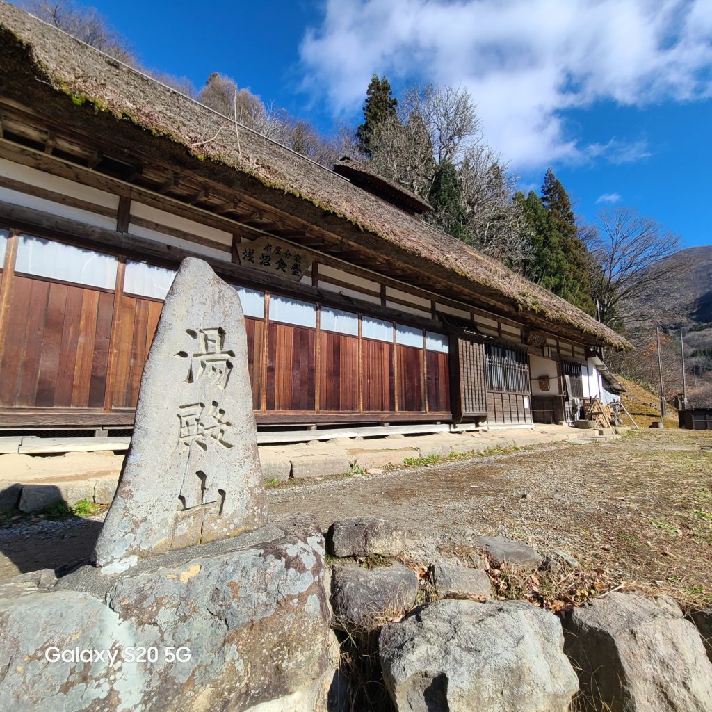 大内宿の最も奥には、写真でよく用いられる街を見下ろす高台があります。その前には立派な古民家を利用した浅沼食堂という食堂がありますが、この日はお休みでした。